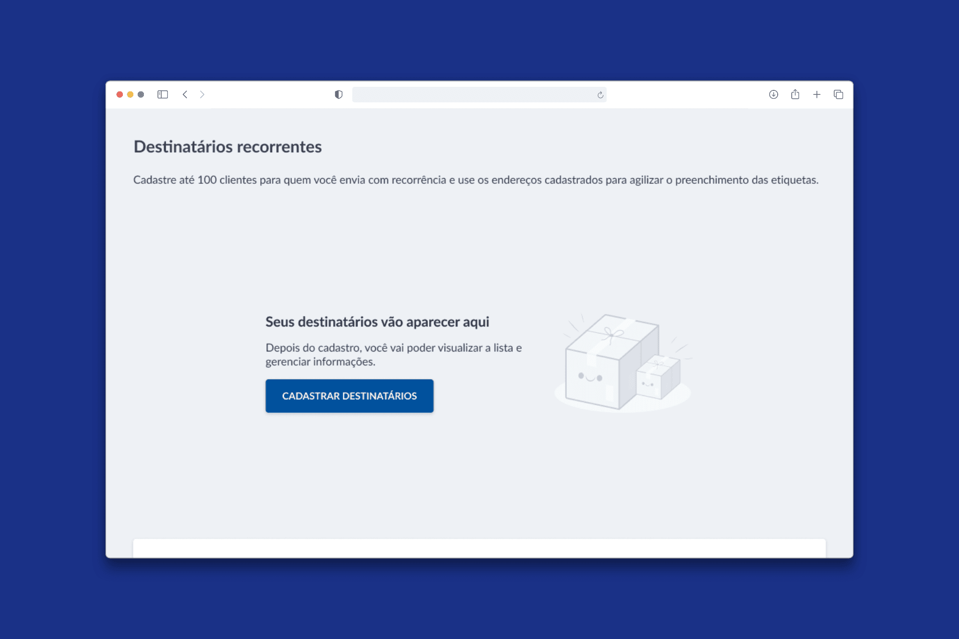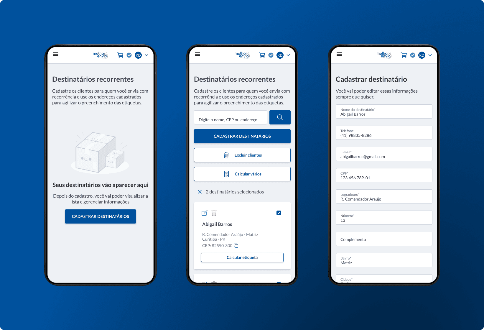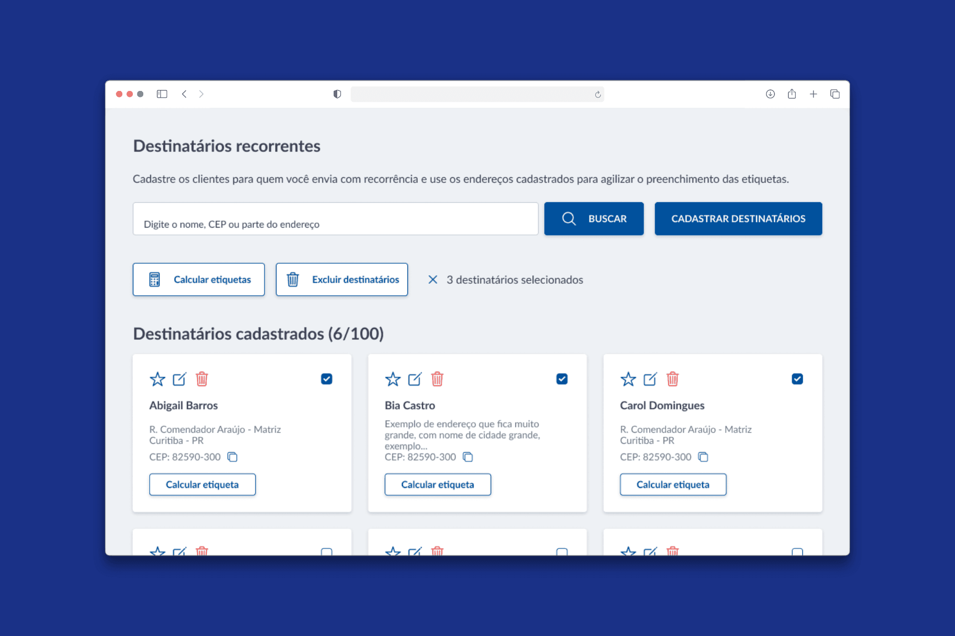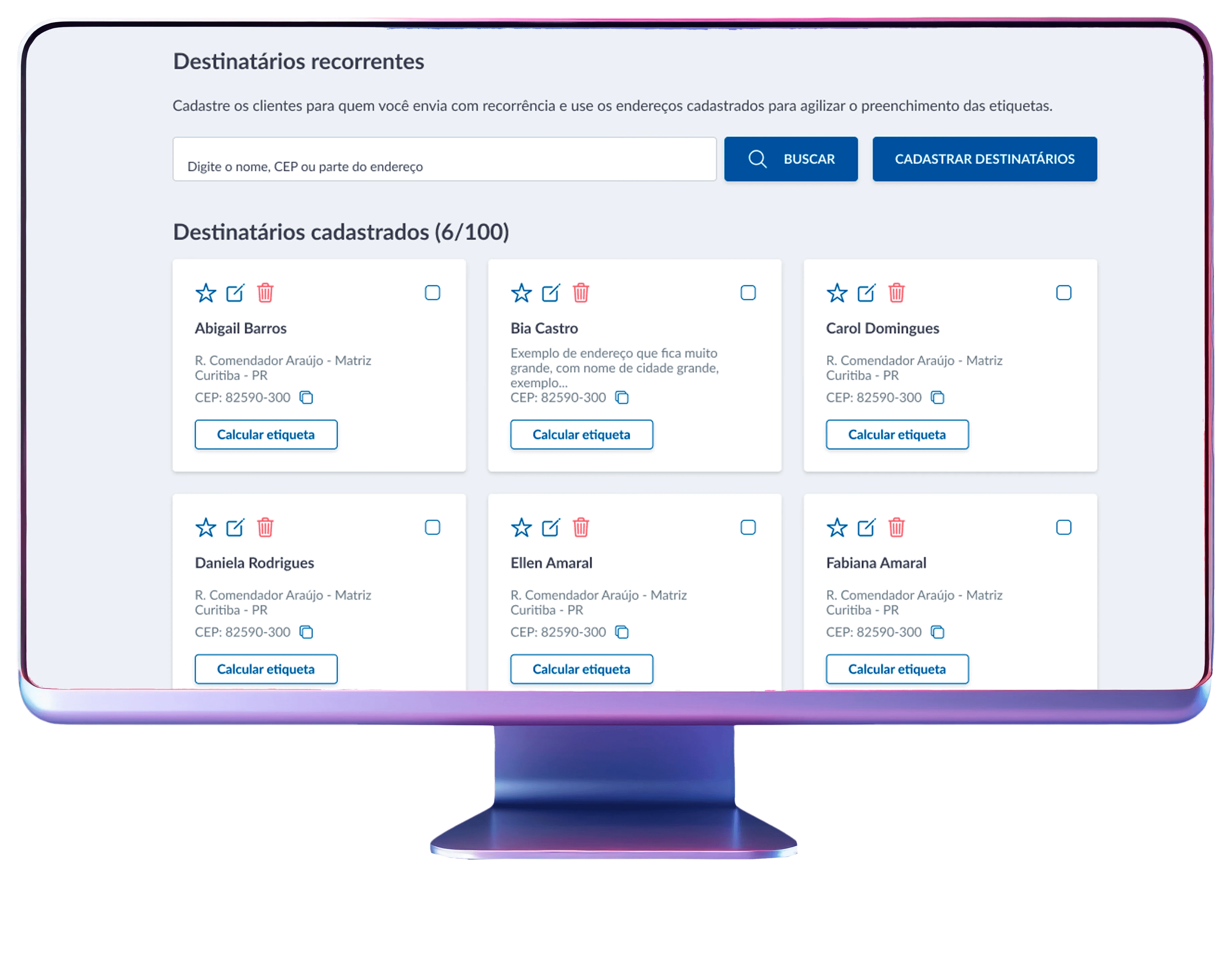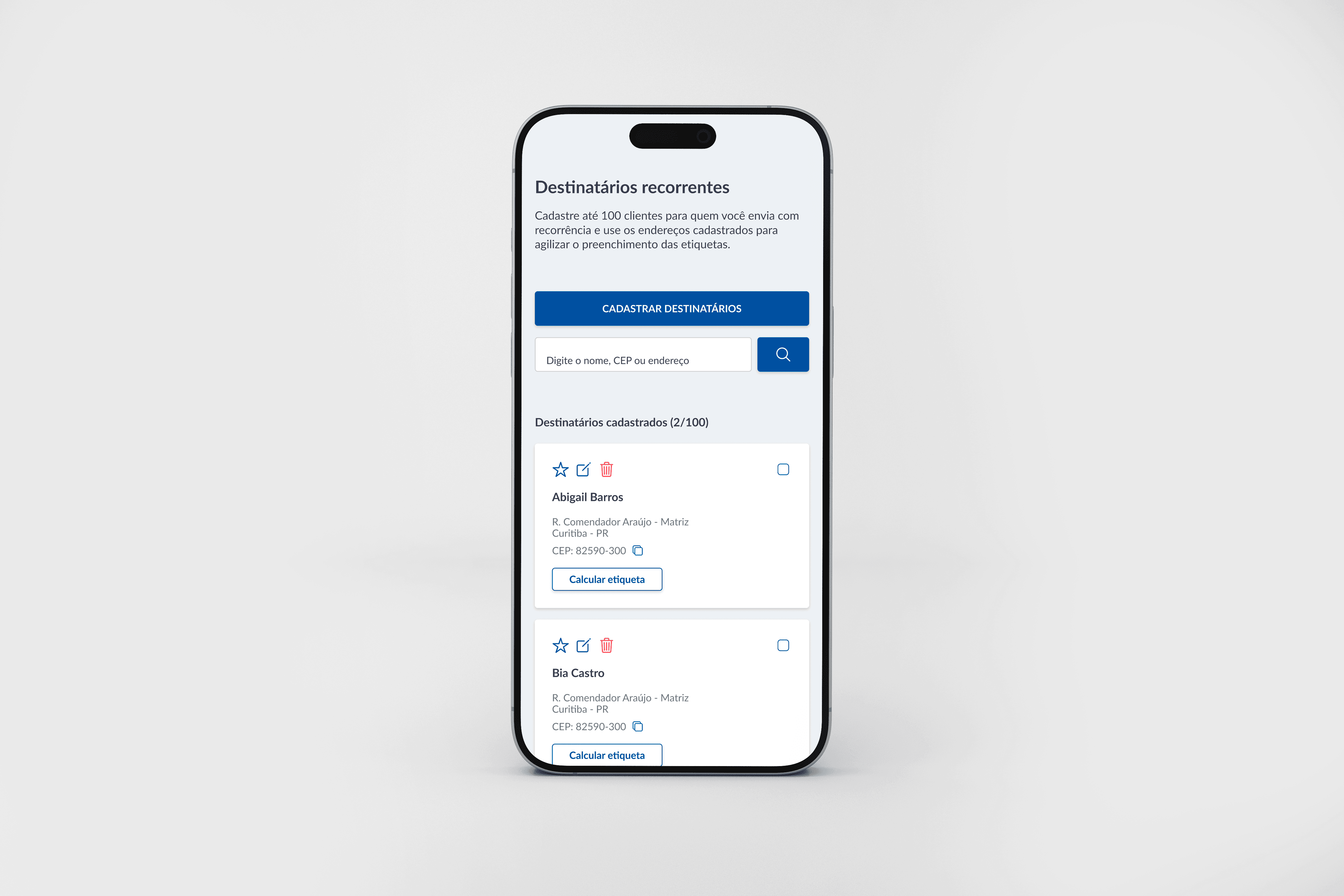 Cadastrar e salvar destinatários de forma simples e rápida;
