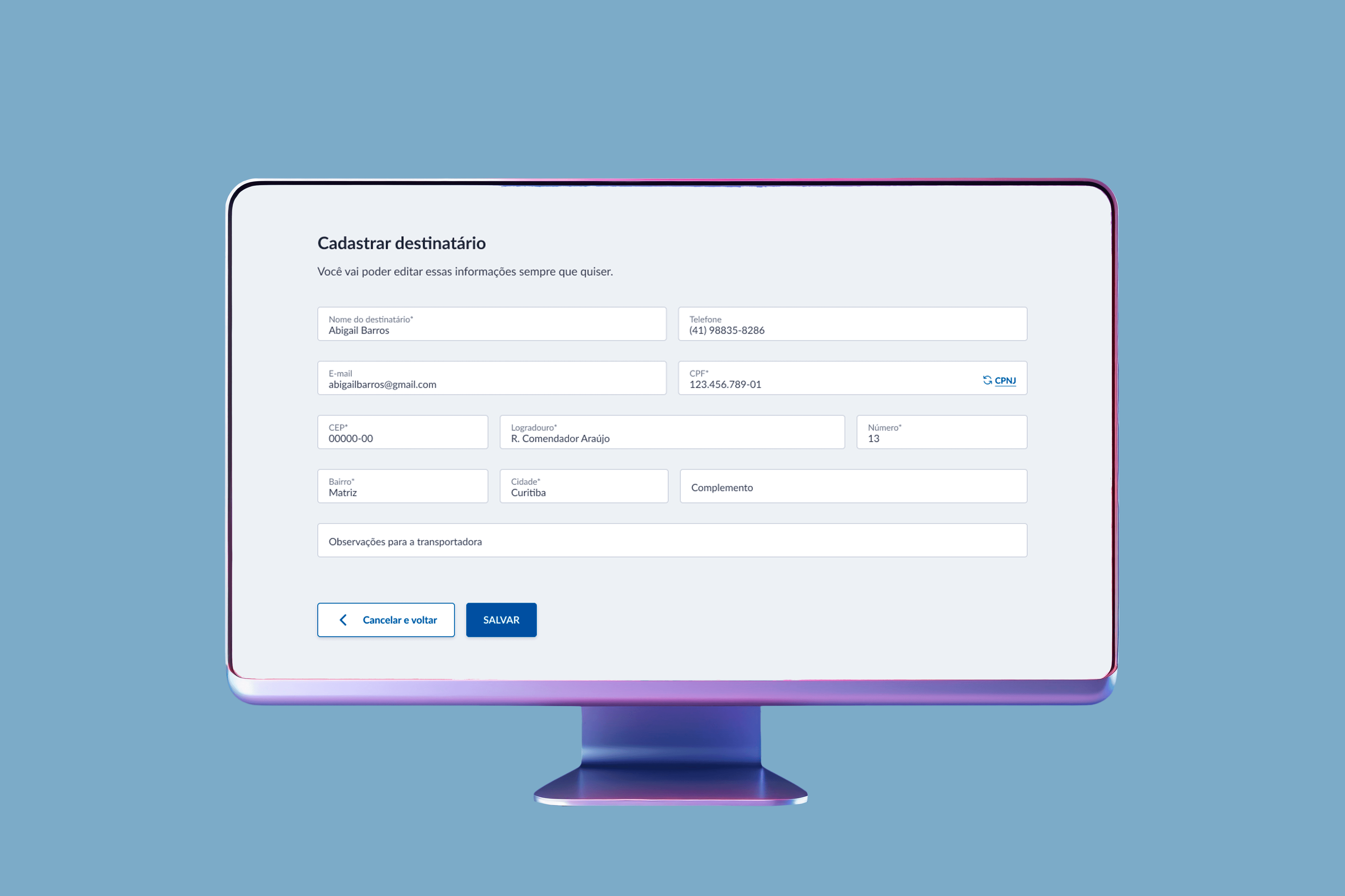 A solução permite que a pessoa salve as informações dos contatos para fazer cotações de frete de forma rápida e diminuir o preenchimento de formulários fiscais, melhorando a rotina de quem vende por assinatura e fidelidade.