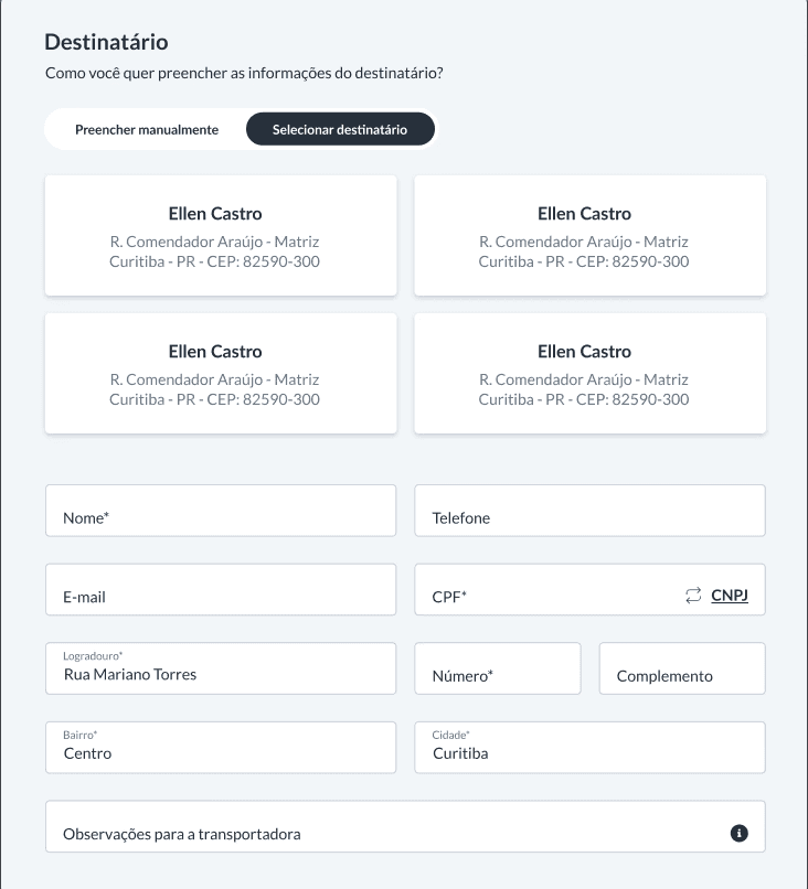 Esse processo gerava perda de tempo e atrito na jornada de quem realiza envios para o mesmo destinatário frequentemente.